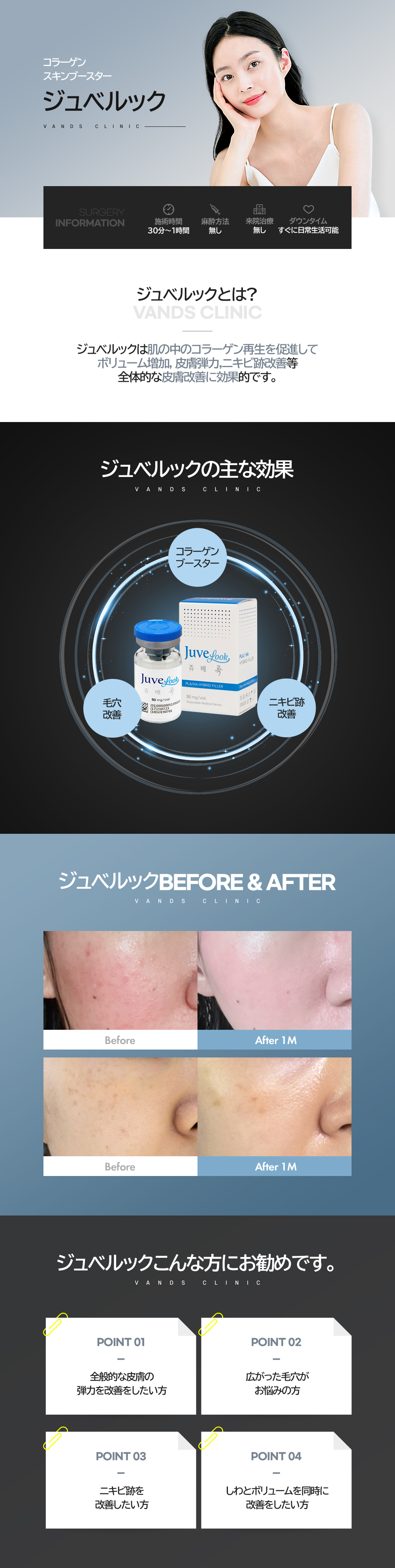 肌に注入された後すぐにボリューム効果が現れる他のフィラーとは違い、自己コラーゲン生成を促進して自然なボリュームを作り、肌の弾力、小じわ、肌のキメ改善にも効果があります。